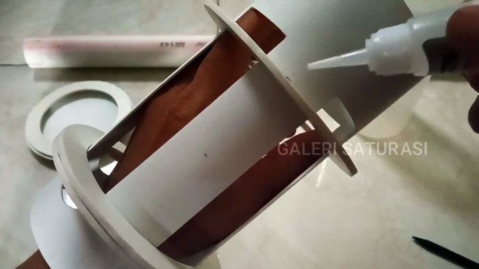 Далее сгибаем прозрачную пластиковую пленку 30×18 см в цилиндр и помещаем в пластиковую трубу с прорезями, выполнив в ней несколько отверстий термопистолетом.