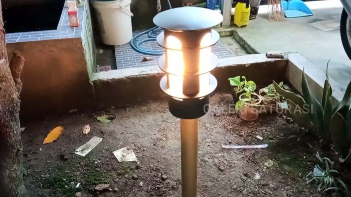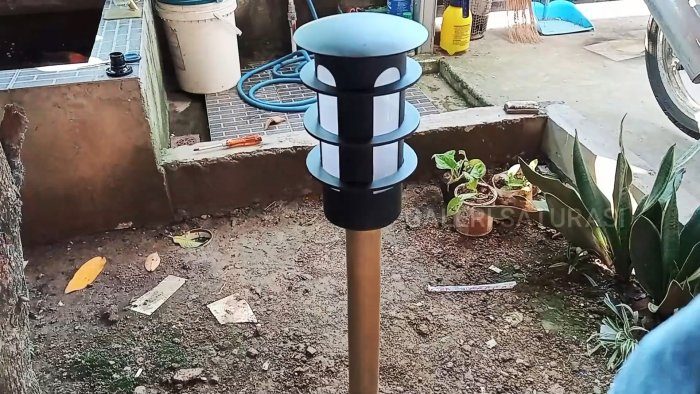 Производим окончательную сборку светильника, заводим в трубу-стойку провод и надеваем ее раструб на пластиковую трубу, зарытую в землю. Снимаем головку светильника, подсоединяем провода к патрону, который закрепляем к крестовине с помощью суперклея.