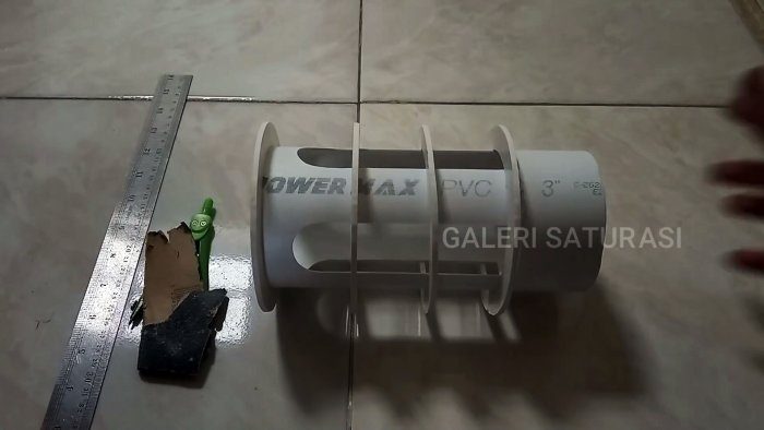 Для дальнейшей работы приготовим трубу ПВХ диаметром 3,2 см и длиной 60 см, выполнив на ее торце взаимно перпендикулярные прорези.