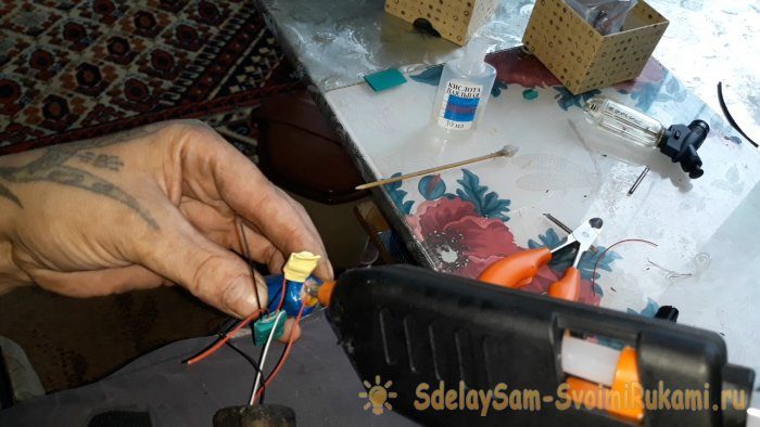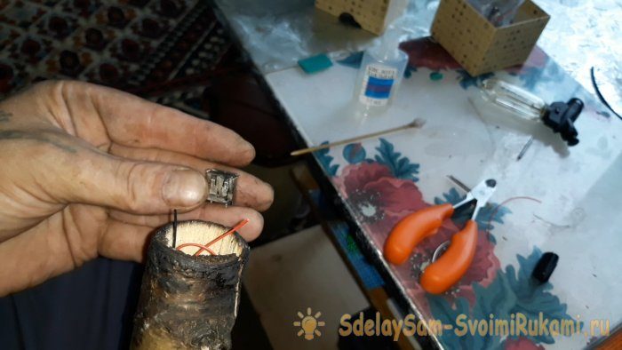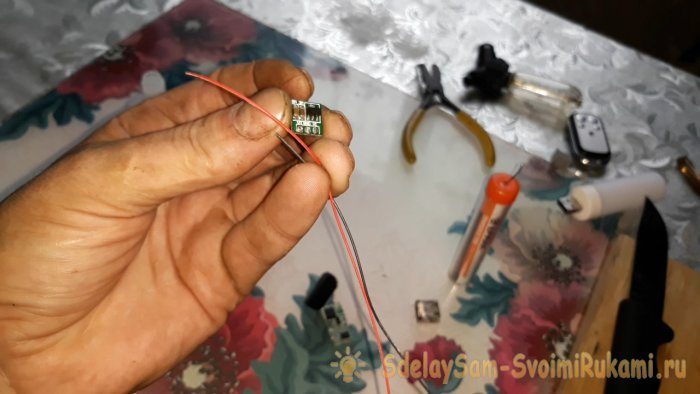 Отверстие под зарядку должно находиться у самого дна углубления. Припаиваем к контактам зарядного модуля проводку, выводим проводку наружу через отверстие вверху, и с помощью секундного клея закрепляем модуль в высверленном для него отверстии.