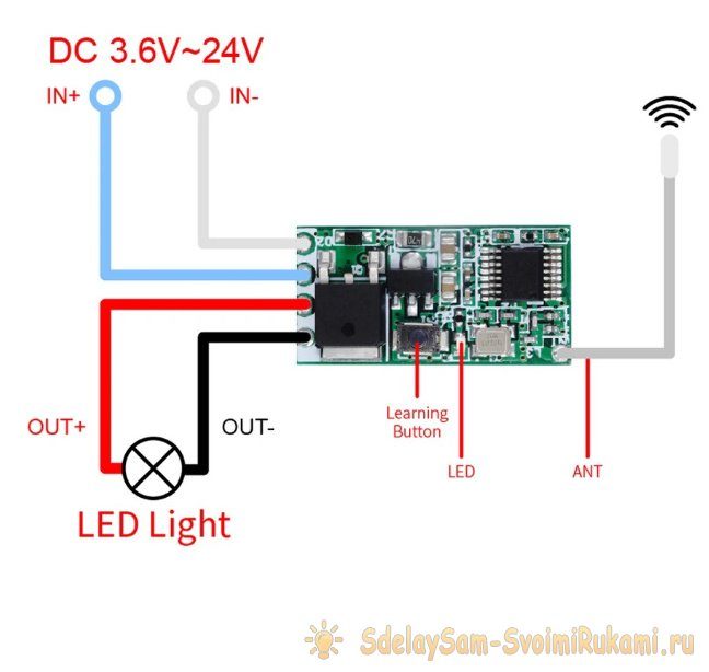 Соблюдаем полярность. Повышающий модуль изолируем термоусадкой. Теперь очередь выключателя. Можно, конечно, было установить и обычный выключатель, но у меня завалялся без дела радиоуправляемый, и я решил его пристроить в этот светильник. К тому же, я подумал, что гораздо проще будет просверлить тонкое отверстие под выход антенного проводка, нежели пыхтеть, выковыривая прямоугольное отверстие под выключатель. Итак, впаиваем выключатель согласно схеме.