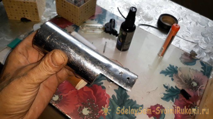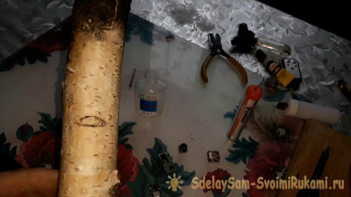 Сделать это можно и обычной турбо-зажигалкой, или газовой паяльной лампой, да хоть на газовой плите с хорошей вытяжкой, в конце концов! Я же, в силу обстоятельств оказавшись в лесу, просто развёл костёр и там провёл все подготовительные работы с заготовкой. Почему важно именно обжечь? Это нужно, дабы придать необходимый декор заготовке. Никакой краской Вы не добьётесь такого результата. А потом, по ходу работы, мы и будем дополнять чёрной краской нужный колер. Итак, подготовив внешний вид и размер, нужно сделать в опаленном конце углубление, для аккумулятора и микросхем. Делать мы будем это при помощи сверла и пера. Сначала просчитаем необходимую глубину, чтоб туда вместилась вся вышеупомянутая начинка. Далее, по центру высверливаем сверлом на 10 мм отверстие нужной глубины. Теперь по этому отверстию работаем пером.