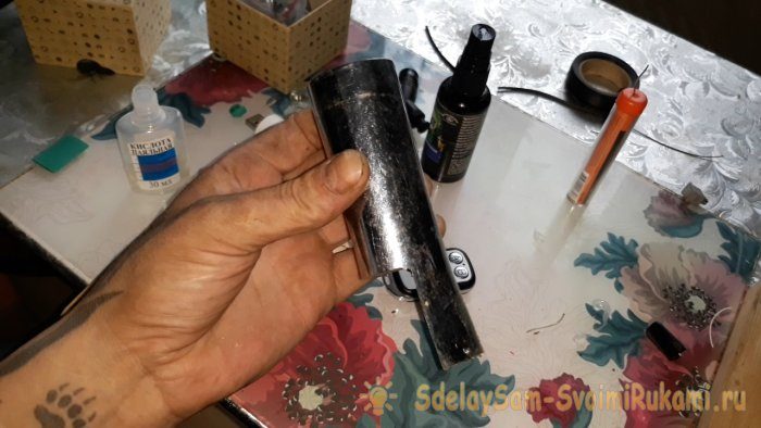 Провод антенны можно укоротить до минимума, ободрать с него оплётку, и приклеить к наружной стенке факела.