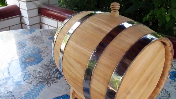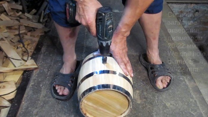 Выполняем подставку, ставим бочонок, сверху сверлим заливное отверстие диаметром 20-22 мм, шлифуем наждачкой и закрываем деревянной пробкой.