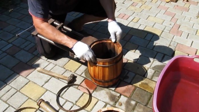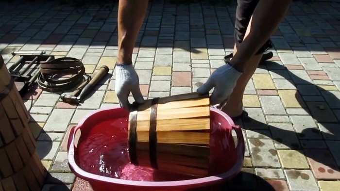 Прогреваем собранные клепки на огне изнутри и окунаем в емкость с водой, т. е. пропариваем, что нужно для облегчения сжатия клепок струбциной.