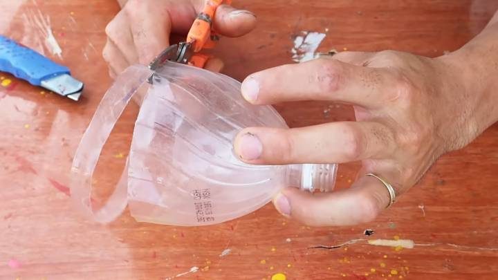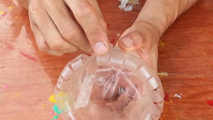 Наденьте его поверх нижней части с дном. Теперь возьмите ножницы и сделайте надрезы на пластике до этого кольца.