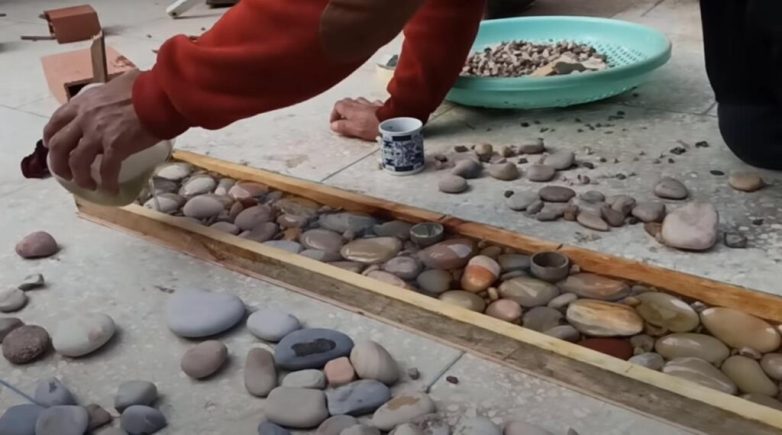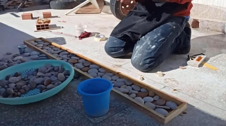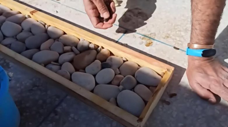 Укладываем гальку внутрь собранной опалубки максимально вплотную друг к другу. Зазоры между ними заполняем более мелкой щебенкой.