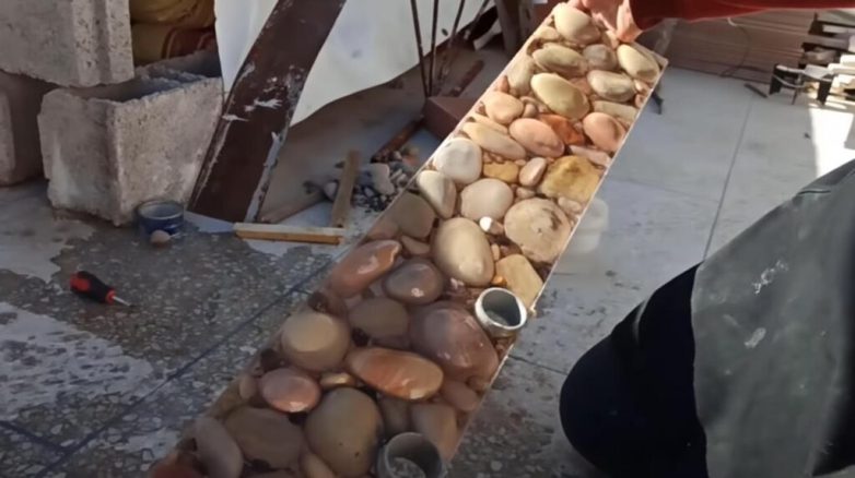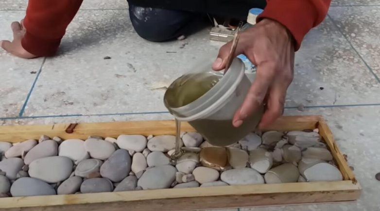 После этого смешиваем эпоксидную смолу с отвердителем и заливаем гальку за несколько подходов.