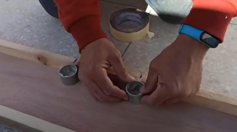 Поскольку данная декоративная панель будет устанавливаться в ванной комнате, внутрь опалубки дополнительно устанавливаем два кусочка пластиковой трубы, предварительно обернув заготовки малярным скотчем (в результате в готовом изделии получатся отверстия под водопроводные трубы.