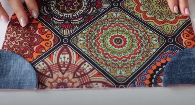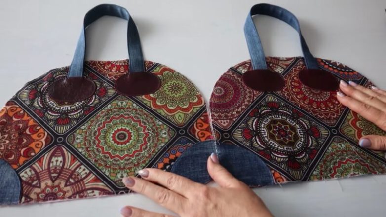 Из подкладочной и джинсовой ткани выкроите детали для изготовления верхней части сумки.