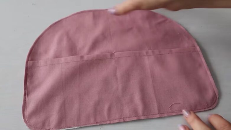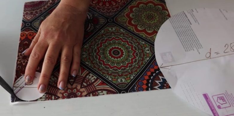 Из основной ткани (можно, к примеру, использовать старый шарф) выкроите две одинаковые детали размером 26 см х 33 см. С изнаночной стороны укрепите ткань дублерином. Края деталей необходимо закруглить, сделать это удобно с помощью картонных кругов. Для этого потребуется два шаблона: круг диаметром 6 см и круг диаметром 28 см. Нижнюю часть заготовок закруглите с помощью маленького круга, а верхнюю — с помощью большого.