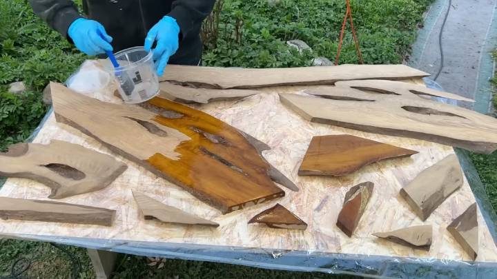 Если у вас имеются ненужные обрезки досок, которые, казалось бы, уже никуда не приспособить, посмотрите идею ниже! Мастер сумел реализовать потрясающую идею из остатков дерева и эпоксидной смолы — сделал уникальный дизайнерский столик, от которого не оторвать глаз.