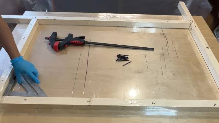 Теперь необходимо собрать каркас будущего стола. Бруски выставляются по уровню (размер стола — 120*70 см), для надёжности фиксируются саморезами. Подложка — оргстекло, под ним — фанера. Бруски предварительно замотаны скотчем.