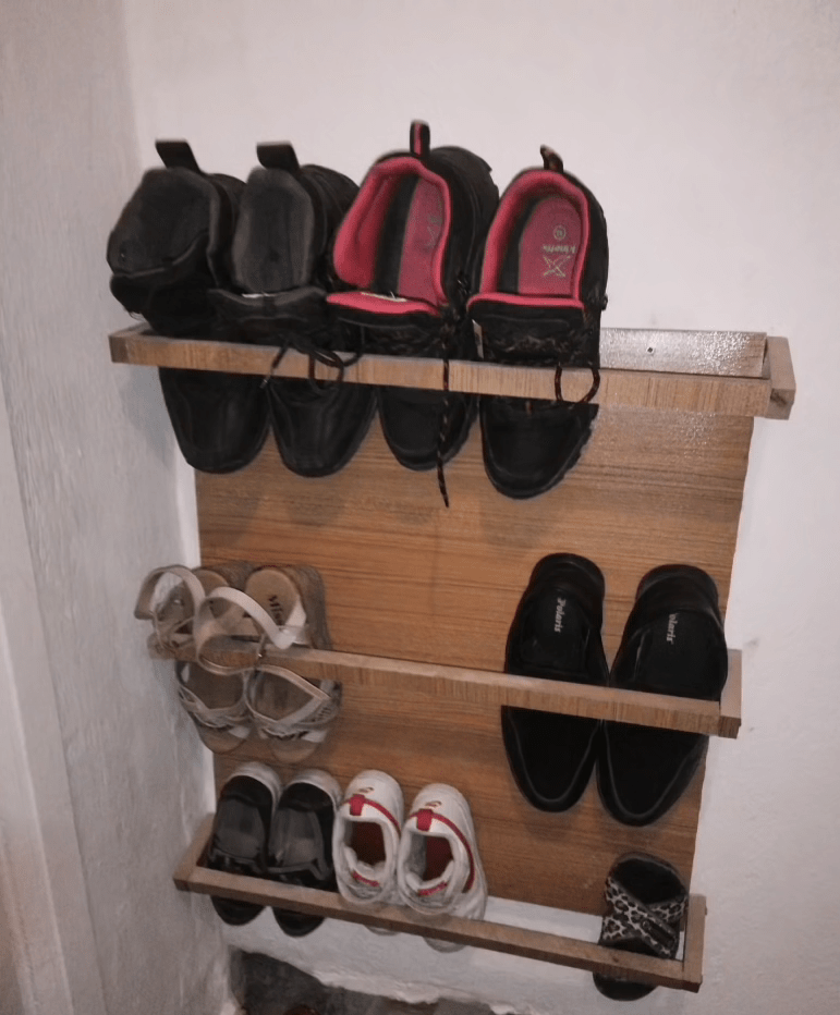 Короткие рейки можно нарезать заранее или подогнать под нужный размер после крепления первого держателя. Количество держателей, а также высота и ширина стенда могут быть разными. При этом важно, чтобы расстояние между ними было достаточным для того, чтобы беспрепятственно доставать или возвращать на место отдельно взятую пару обуви.