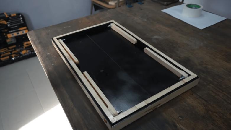 Размеры столика могут быть разными. Первым делом нарезаем ламинат на полосы одинаковой длины, которые необходимо будет состыковать и дополнительно проклеить. В качестве обрамления используем остатки обрезной доски или бруса. По сути из нее нужно сделать обычную рамку с пазами, но более высокую.
