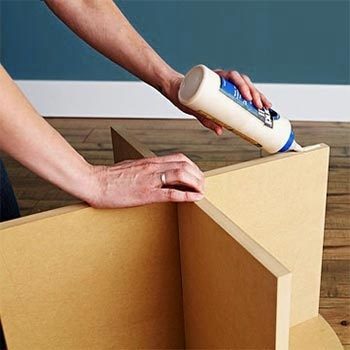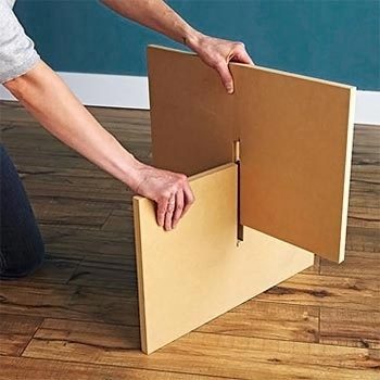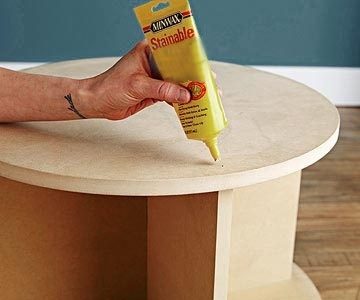 Следующий шаг — сборка. Обозначив середину столешницы, переворачиваем ее лицом вниз и совмещаем с крестовиной. Затем накрываем крестовину нижней площадкой, которую так же укладываем лицом вниз. Детали можно просто склеить при помощи мебельного клея или добавить дополнительные фиксирующие элементы, насверлив в деталях не сквозные отверстия и вставив в них чопики.