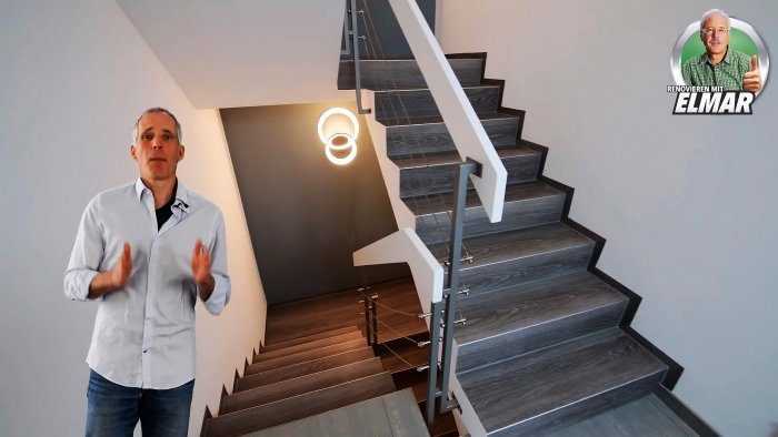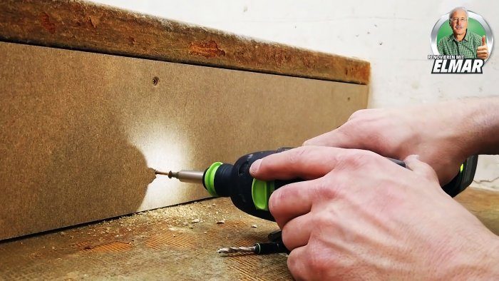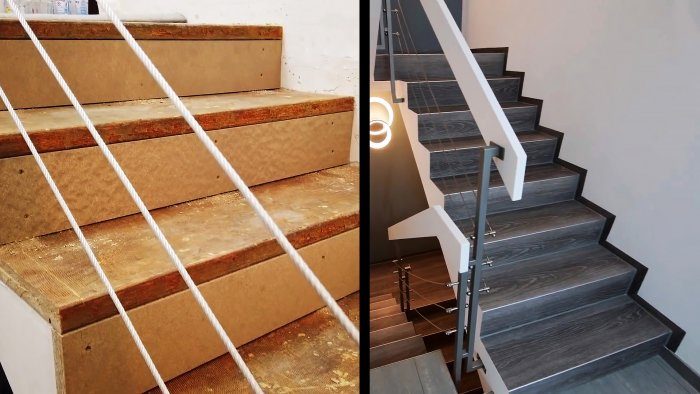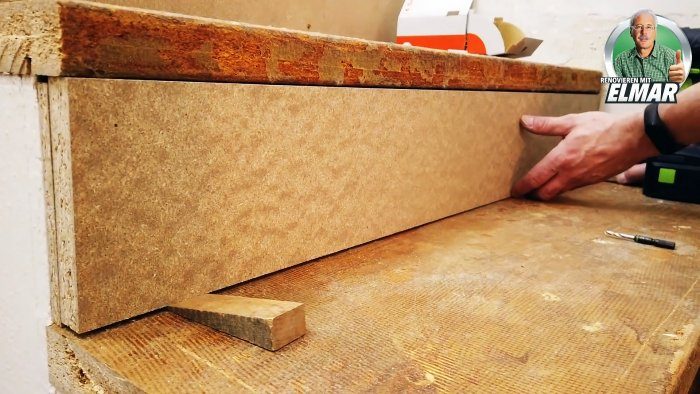 Если степень выступает в бок за косоур лестницы, то ее нужно обрезать, так как отделать этот участок виниловой плиткой не получится. Спилить ее можно лобзиком или ручной циркулярной.Чтобы виниловая плитка хорошо удерживалась, ее важно клеить только на ровное гладкое основание. Если проступи выпирают за подступенок, их нужно сравнять. Для этого на подступенок можно прикрутить ДСП подходящей ширины. Важно не жалеть саморезов, и делать все жестко.