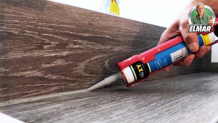Последним штрихом является заделка стыков в углах. Для этого применяется обычный силиконовый герметик, подобранный в тон.