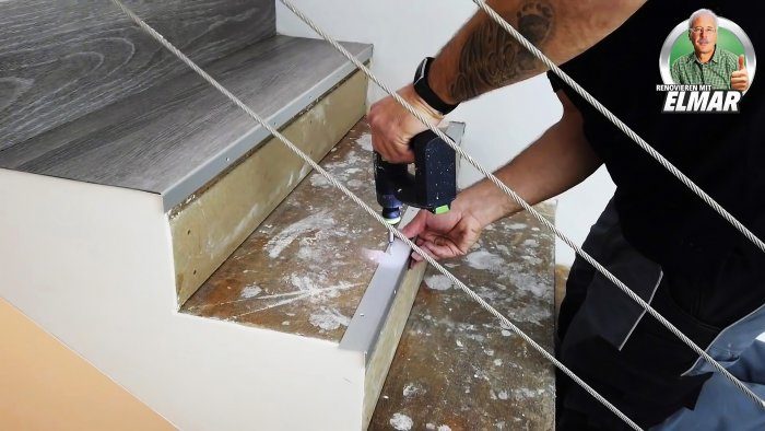 Затем на углы ступеней прикручивается наружный закладной алюминиевый профиль.