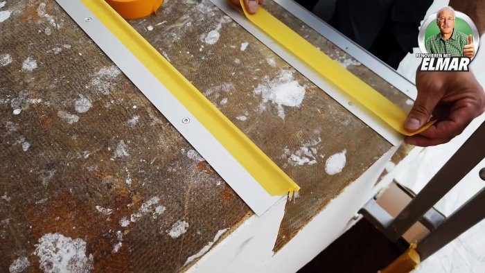 ДСП; наружный закладной алюминиевый профиль для виниловой плитки; силиконовый герметик; эластичный наполнитель для дерева; саморезы;