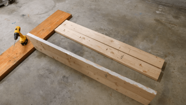 Доски присоединяются одна к другой поочередно. Прежде чем вкручивать шурупы, рабочую доску следует обильно покрывают клеем сбоку и состыковать со следующей.