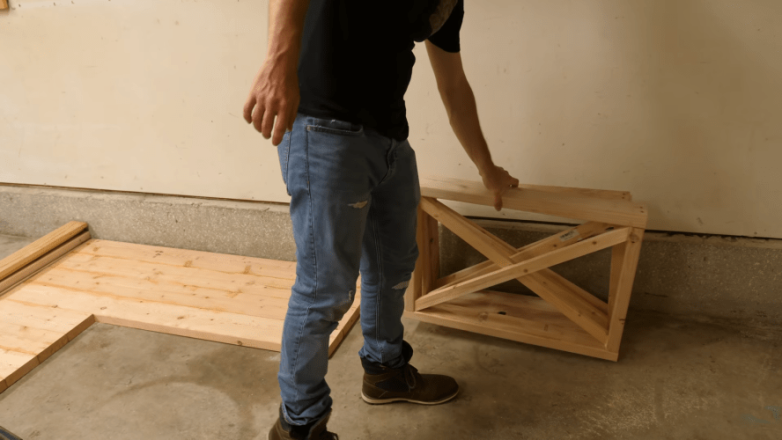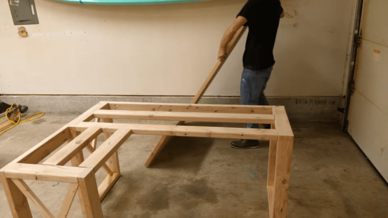 Для столешницы понадобится по 4 длинных и коротких доски. Боковые стенки у стола отсутствуют их с успехом заменяют 3 прямоугольные рамы, дополненные крестовинами, одновременно выполняющие функцию ножек. Ширина каждой из рам меньше ширины столешницы на 5-7 см, а высота соответствует высоте стола, уменьшенной на толщину столешницы. Кроме рам для каркаса понадобится по 3 коротких и длинных доски.