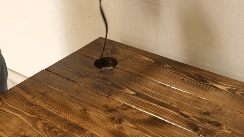 Стол практически готов. Осталось несколько деталей. Сняв крышку, делаем в углу круглое отверстие под провода.