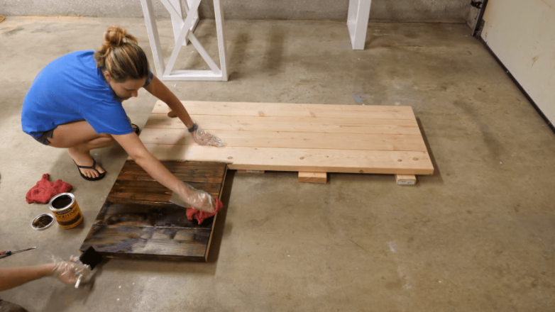 Корпус красим, а столешницу обрабатываем морилкой, а затем покрываем лаком. После полного высыхания собираем стол окончательно.