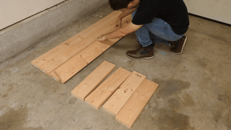 Подготовив материал для столешницы, стыкуем доски, подбирая при необходимости рисунок. Каждую из досок помечаем, чтобы выдержать нужную последовательность при сборке.