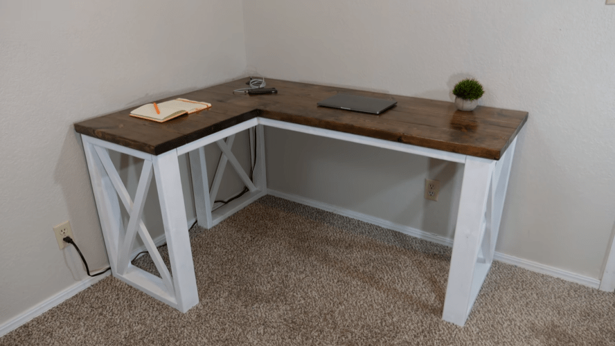 Конкретных размеров стол не имеет. Исходить при расчетах нужно из количества материала и наличия свободного пространства. По сути стол состоит из столешницы Г-образной формы и каркасной основы.