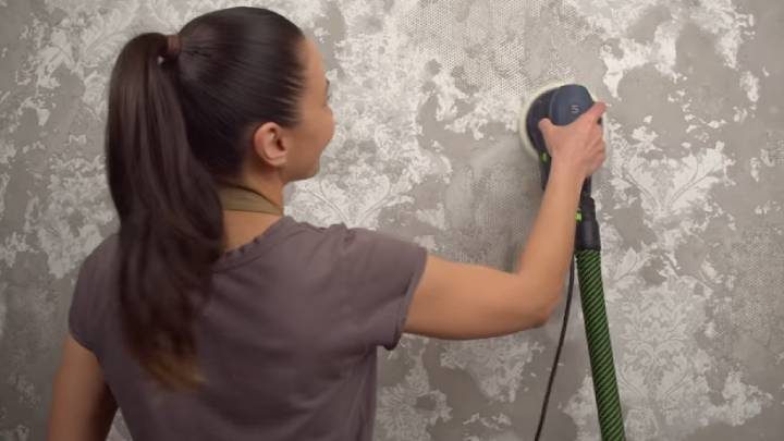 Теперь на пустые участки нанесите просто гипсовую штукатурку, прикладывая кельму. Когда всё просохнет, возьмите шлифмашинку или наждачную бумагу и выровняйте поверхность.