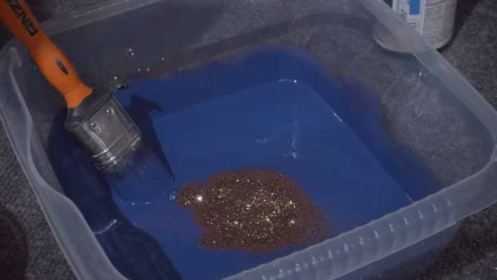 После этого стену нужно пропитать воском. Для этого смешайте клей для обоев с акриловым лаком в пропорции 2:1 (поллитра лака и 1 литр обойного клея). Сюда же можно добавить блёстки.