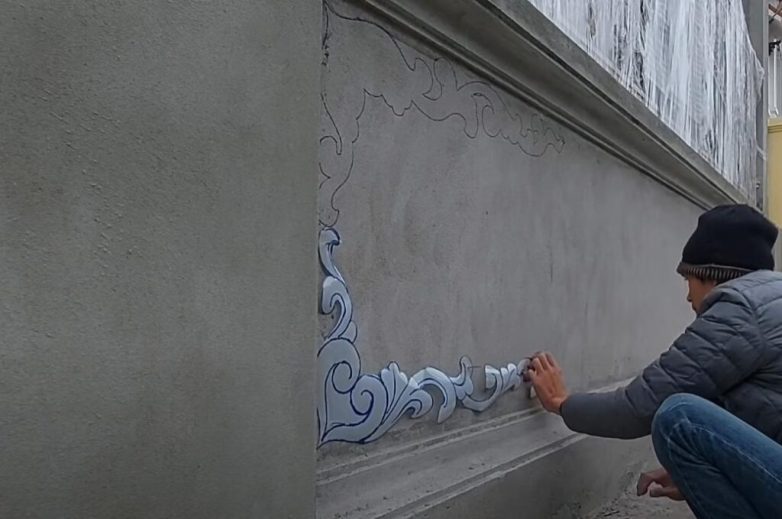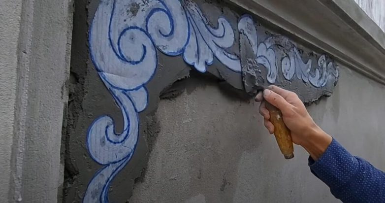 Теперь прикладываем трафарет и обрезаем лишние куски раствора, придавая ему нужную форму. Потом останется только довести орнамент до ума.