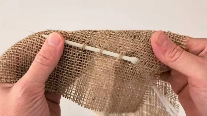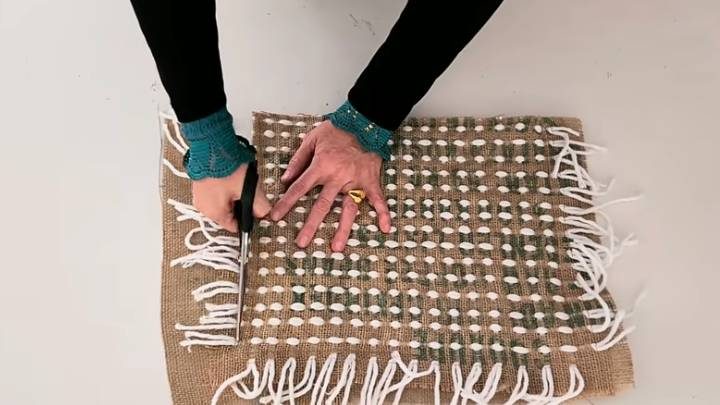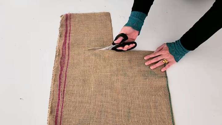 Вырежьте из мешковины квадрат. Отступите от края 3 см. Теперь через каждый 1 см вытягивайте нити по вертикали. Затем переверните и то же самое сделайте по горизонтали.
