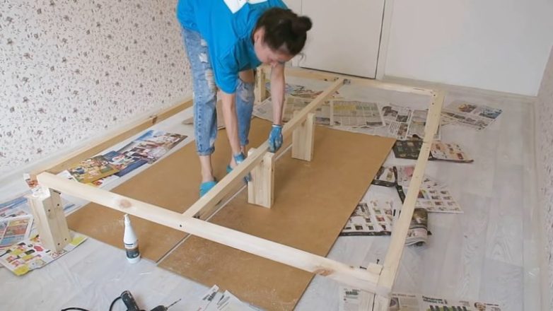 Далее, устанавливаются и закрепляются основные перекладины, которые будут держать матрас. Укладывается щит на основание. Лишняя длина обрезается.