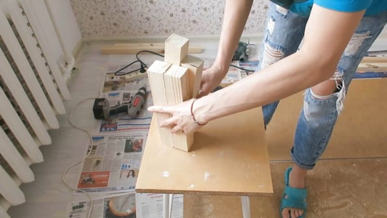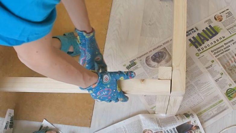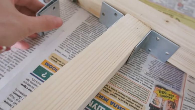 Из тех же брусков строим основание. Присоединяем планку по середине корпуса с помощью клея ПВА для дерева и саморезов, а также дополнительно укрепляем уголками.