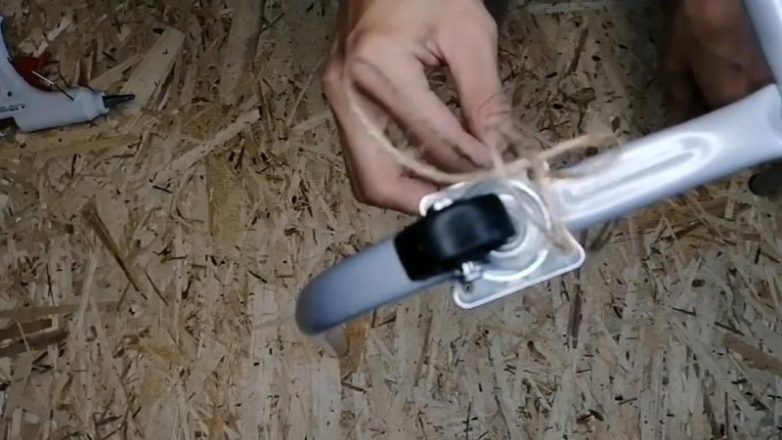И к отверстиям прикрутите или приклейте колёсики. Для лучшей фиксации, если вы использовали клей, а не болты, вденьте джут и тщательно закрепите.