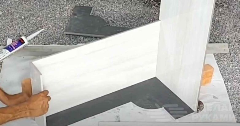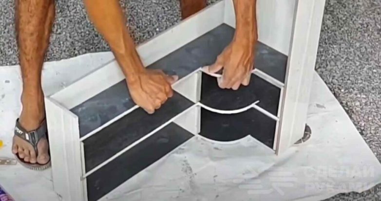 Затем из кусочков плитки автор делает перегородки, на которые укладывает остальные две полки.