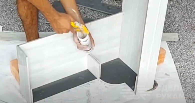 После этого можно приступать к сборке кухонной полки. К основанию автор приклеивает заднюю и боковые стенки.