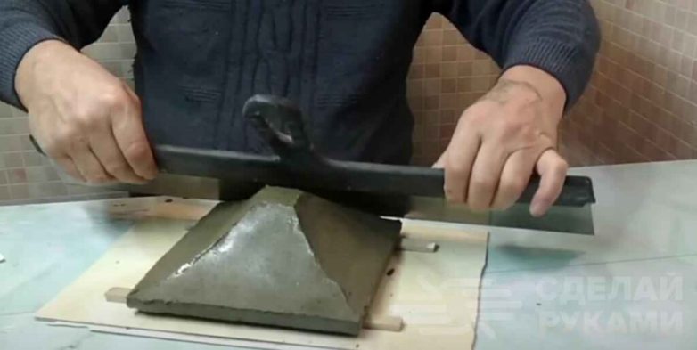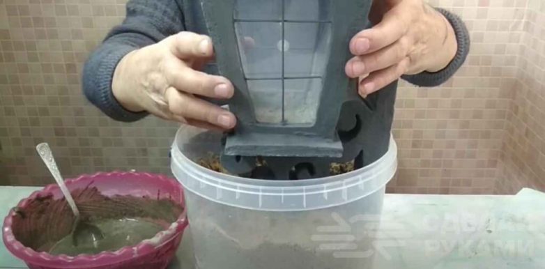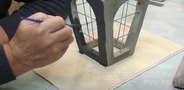На следующем этапе из цементного раствора изготавливаем боковые части фонаря. По центру и по краям устанавливаем металлическую проволоку.