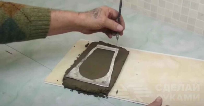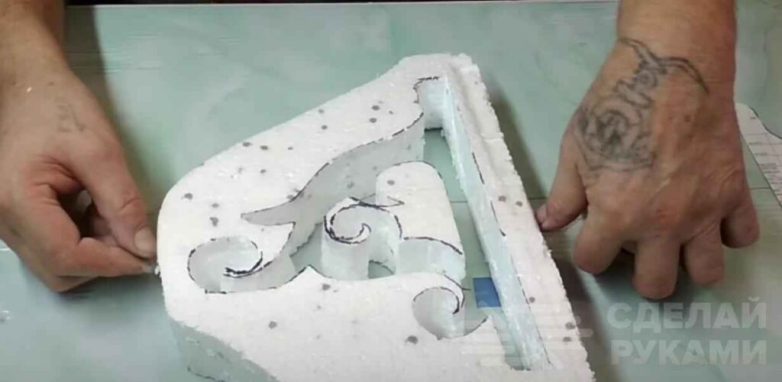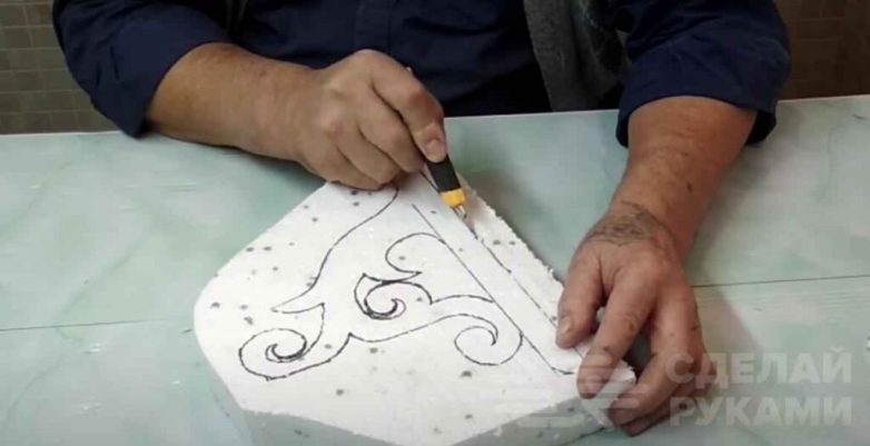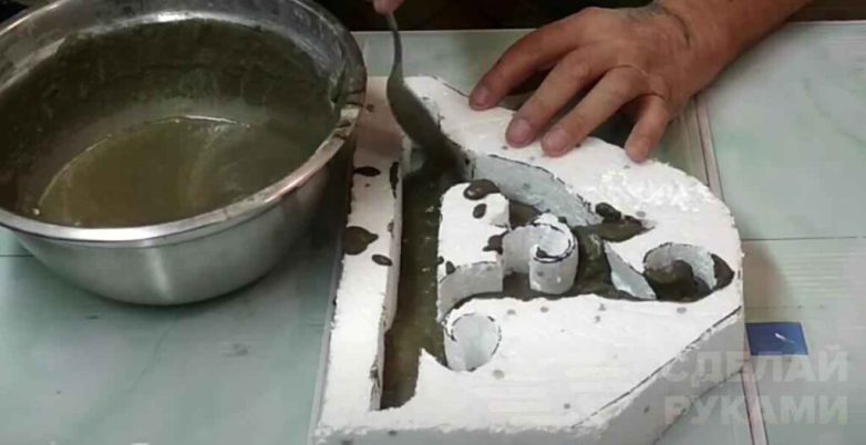 Первым делом необходимо вырезать формочку из пенопласта — для заливки цементного раствора.