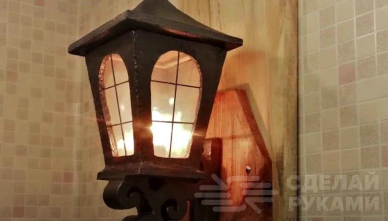 Крепим корпус фонаря к кронштейну. А сам кронштейн прикручиваем к дощечке, которую потом надо закрепить на стене.