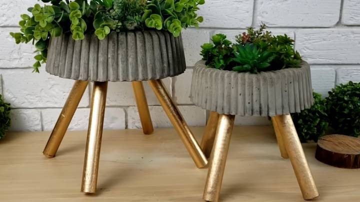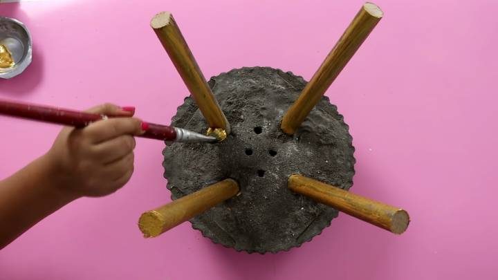 Через сутки удалите пластиковые крышки и песок. Покрасьте деревянные ножки. По желанию цементную заготовку также можно прогрунтовать, покрасить и зафиксировать лаком.