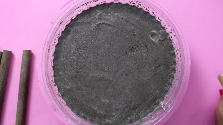 Установите черенок от лопаты, разрезанный на несколько частей. Это будут ножки. В центре в растворе сделайте дренажные отверстия.