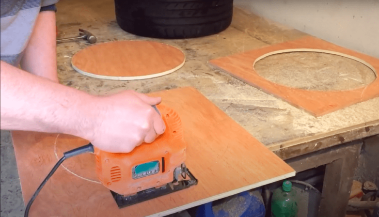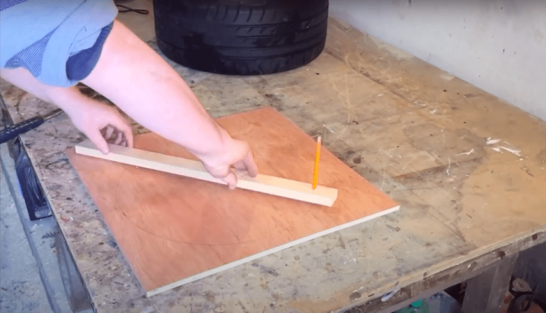 Первым делом необходимо замерить диаметр «пустого места» автопокрышки, так как нам нужно вырезать круг того же диаметра из фанеры. Для этого можно соорудить вот такой простой, но удобный циркуль. Берем небольшую дощечку, отмечаем ее середину, а затем на расстоянии, равном радиусу, просверливаем отверстие и вставляем в него карандаш. Центр циркуля прибиваем к центру доски и прочерчиваем круг.