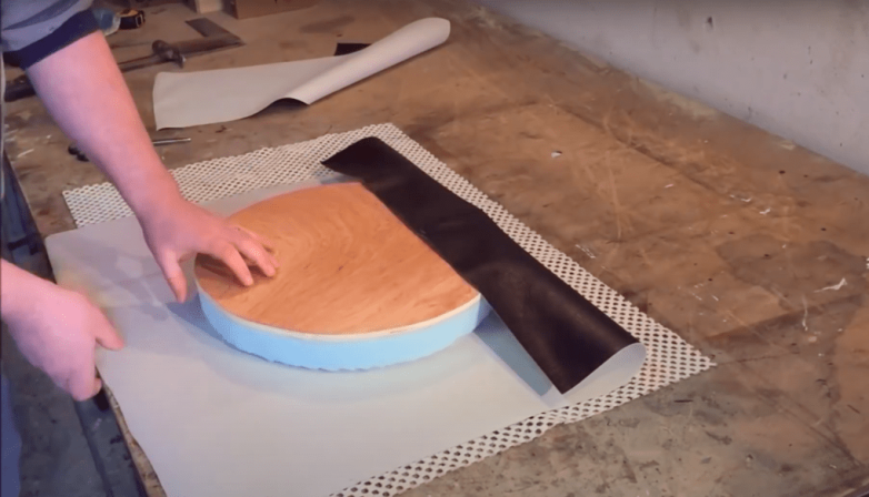Подготавливаем сидушку пуфика. Для этого берем последний кружок из фанеры и, ориентируясь на него, вырезаем круг из плотного толстого поролона. Получившийся поролоновый кружок соединяем вместе с деревянным и перетягиваем их тканью.
