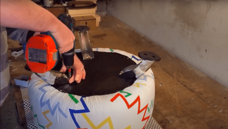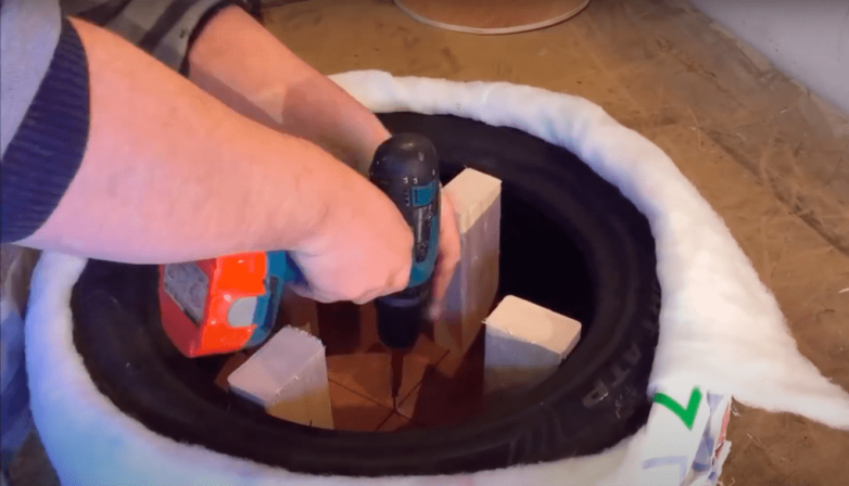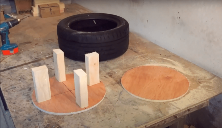 Далее подготавливаем внутренние ножки для пуфика. Они нужны для устойчивости и будут спрятаны внутрь, поэтому, отмеряя их высоту, нужно исходить из того, чтобы они поместились внутрь покрышки. Таких бруска потребуется 4 штуки. Круглую деталь размечаем следующим образом и прикручиваем к ней ножки.
