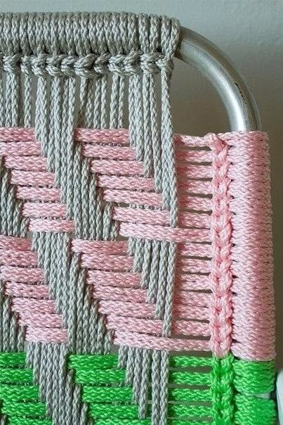 Как будет выглядеть обновленное кресло, решать только вам! Для реализации подойдет любой жаккардовый узор. Дальше останется только переплести нити так, чтобы получился нужный рисунок. По большому счету сам каркас кресла здесь выступает в качестве станка для натяжки. Вот только полотно с него в конце работы снимать не придется, а это существенно облегчает задачу. Еще один важный момент! У шнура при этой технике нет никаких шансов спутаться, так как обрезать по мере протяжки ничего не понадобится.