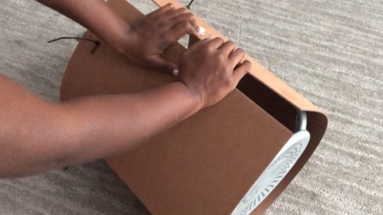 Вокруг пуфа оберните деревяностружечную плиту, или плотный картон, закрепите на ножках хомутами.