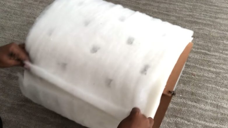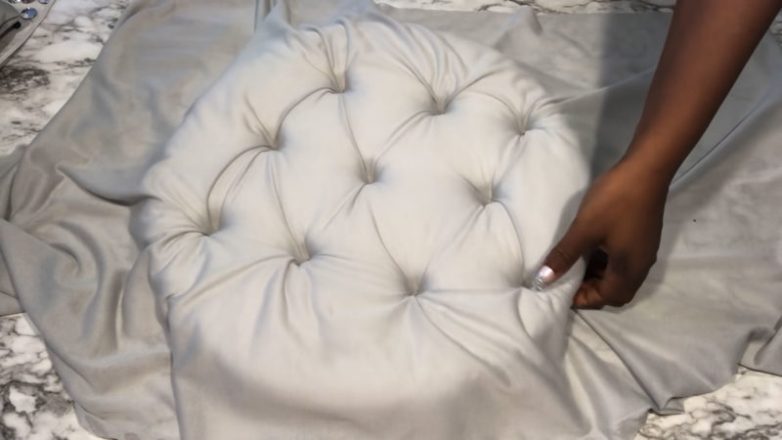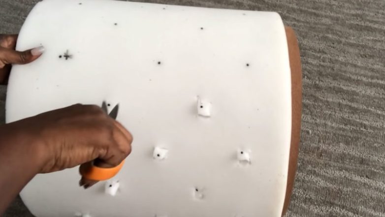 По такому же принципу сделайте крышку для пуфа: на заготовку из дерева или плотного картона приклейте поролон, вырежьте углубления ножницами, приклейте синтепон, затем — ткань, и закрепите её мебельным степлером в углублениях.